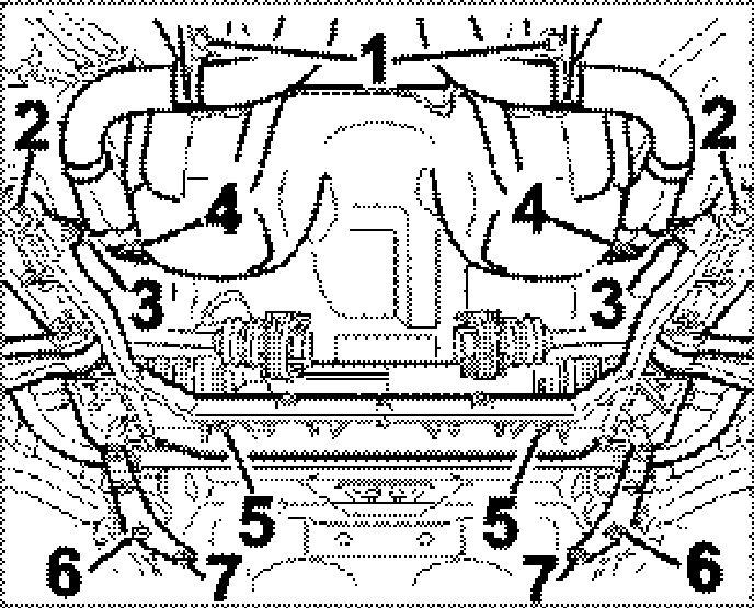 15. Detach suspension subframe. Undo the six hexagon-head bolts at the front and rear -Items 2, 6 and 7- and lower complete suspension subframe by approx. 15 cm.