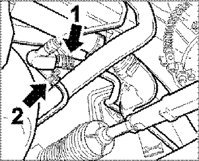 5. Insert vent line into distributor hose in the left front wheel well -2- and into coolant hose in the right front wheel well and fit the spring-band clamps.