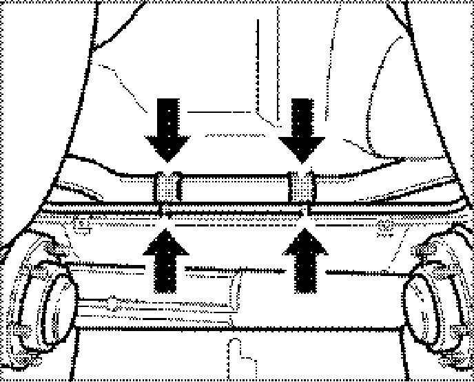 4. Pre-position connector tubes to the radiators together with pre-mounted holders (replace if necessary) in installation position under the fuel tank. Clip holders to the body. To do this, hook the holders at the front and engage the tab at the rear. Push the left and right pipes into coolant hoses and tighten screw-type hose clamps.