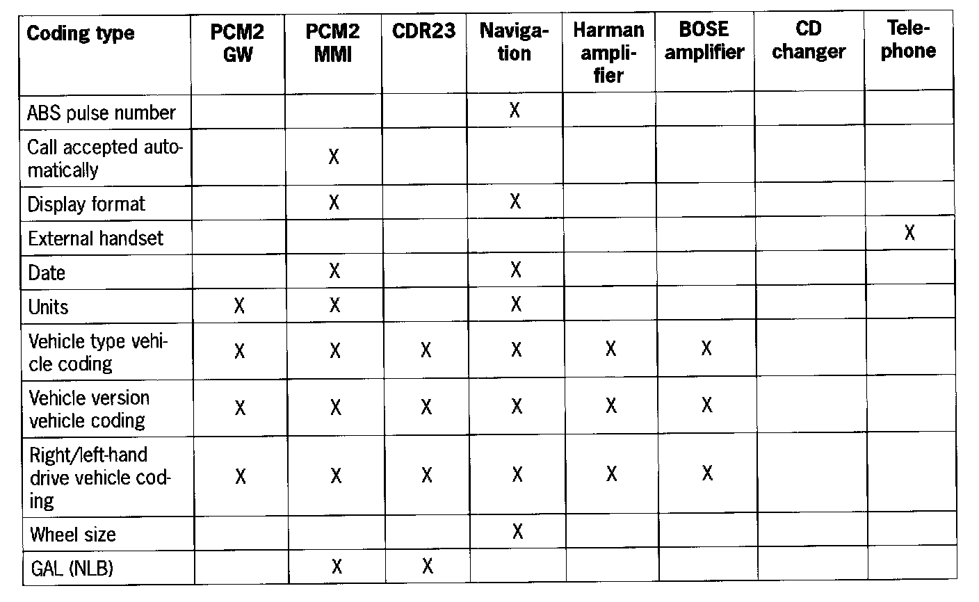 Under the menu item 'Modify coding', the PCM2 codes can be coded on a vehicle and country-specific basis.