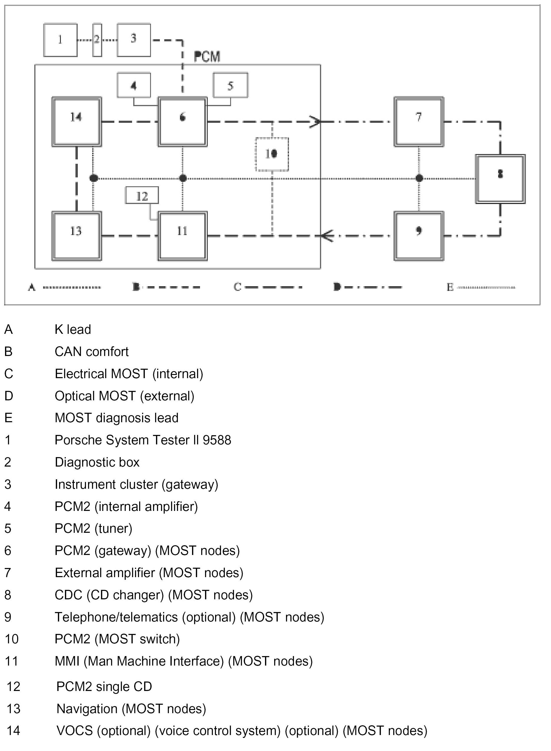 NOTE: When there is a customer complaint or identifiable problems but no fault code entries, firstly the MOST component check is to be selected in the PCM2 function selection menu and then the MOST system check is to be carried out.