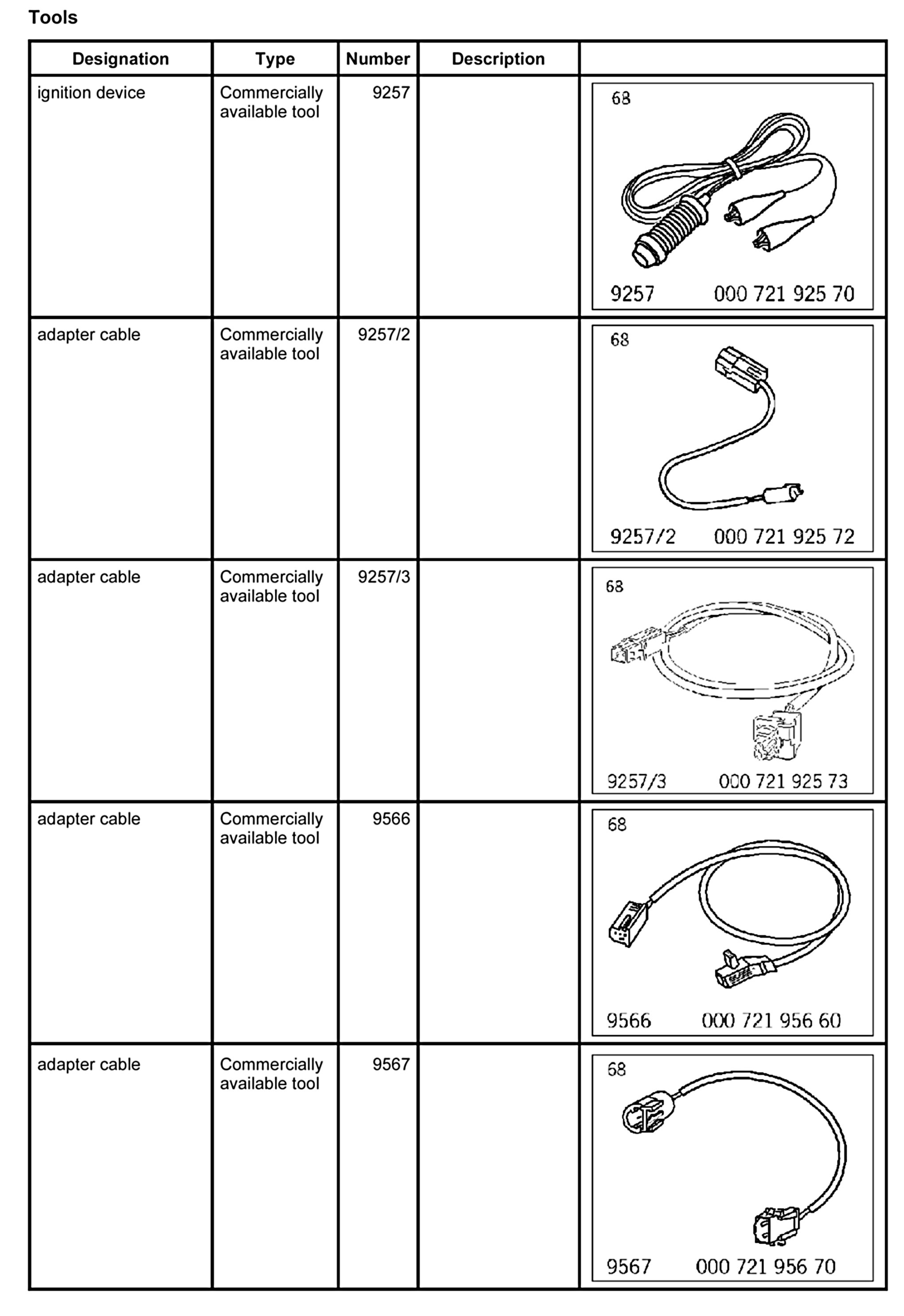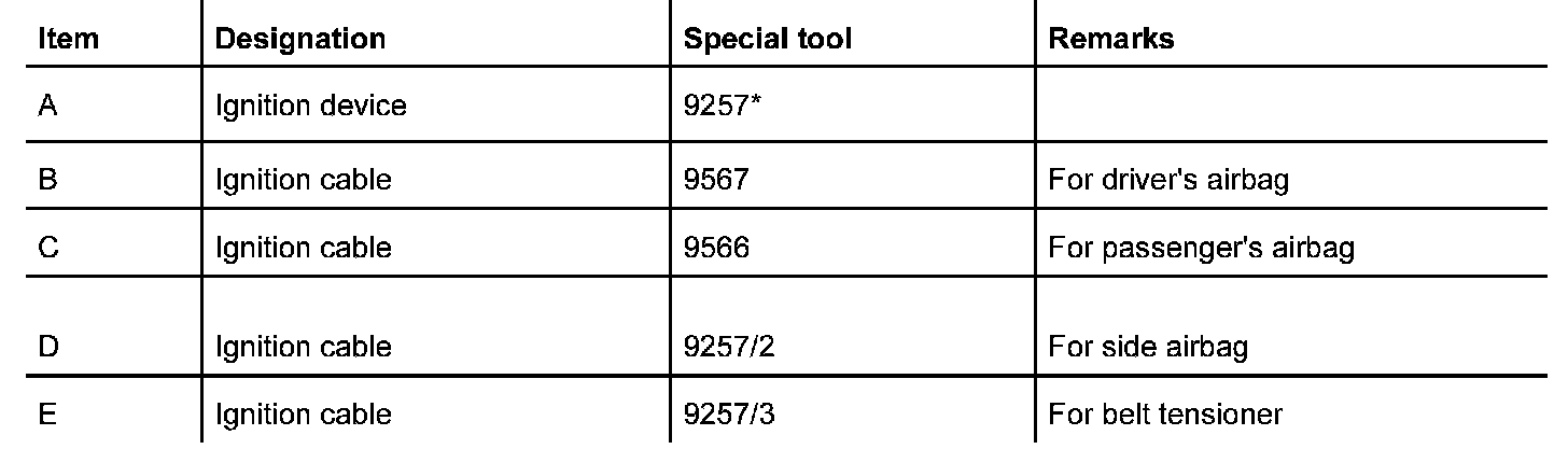 - If the vehicle had suffered fire damage which caused one or several airbags or the belt tensioner to be ignited, additional ignition with the ignition device 9257 must be carried out in order to ensure that only parts without pyrotechnical contents are scrapped!