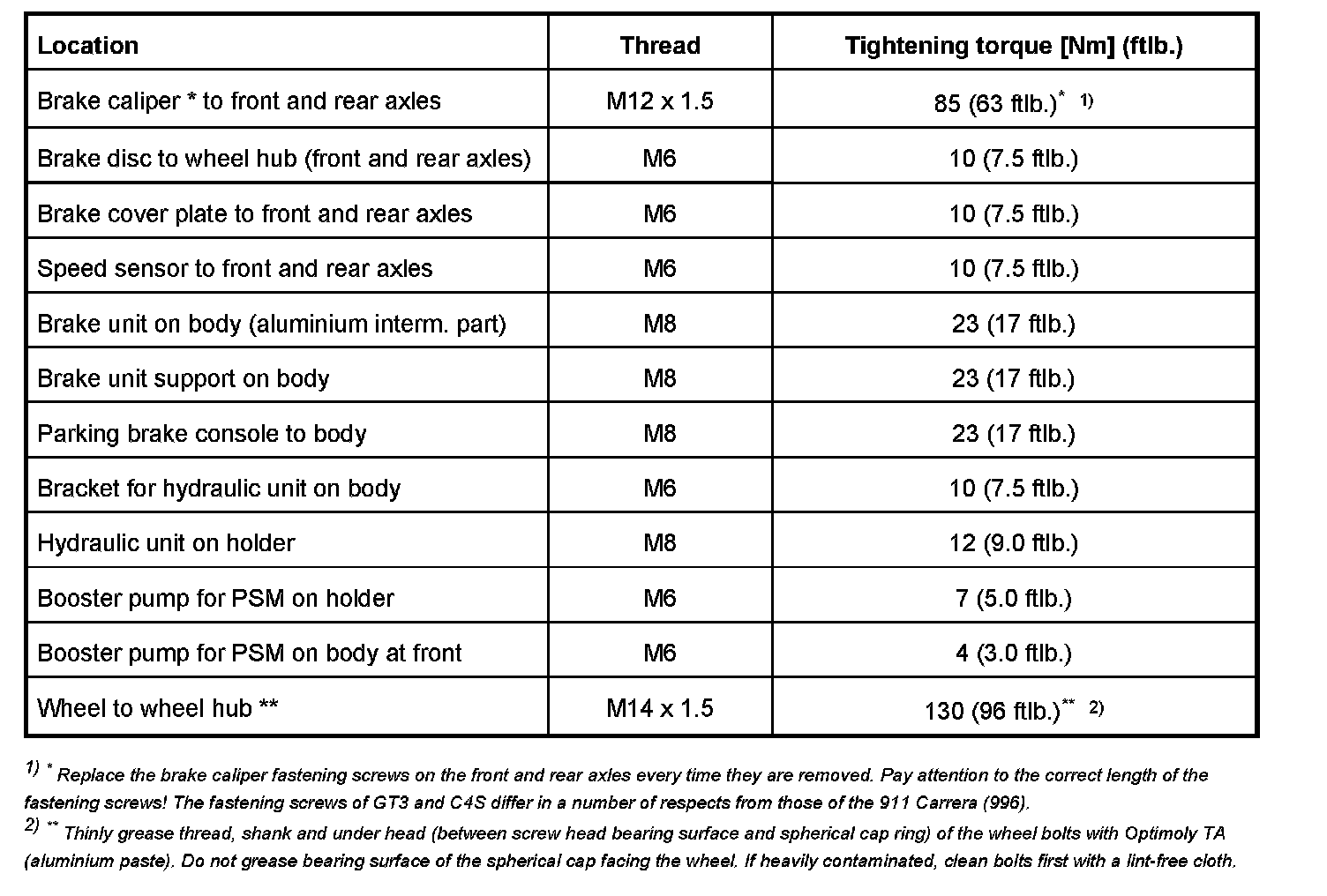 Tightening torques for mechanical brake