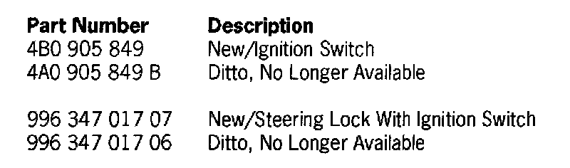 As of the date of introduction below, a modified ignition switch will be installed in vehicles. For spare parts replacement of the ignition switch, only the new ignition switch part number, 4B0 905 849, is available now as a replacement part.