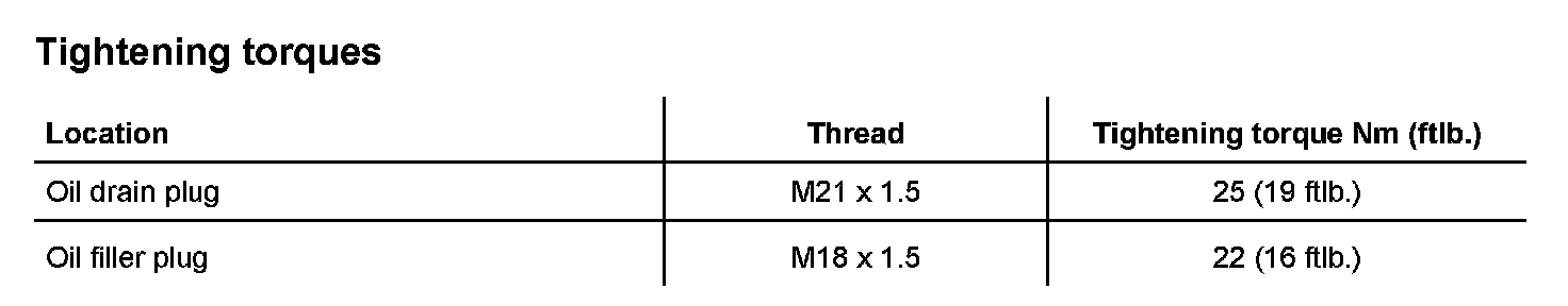 Drain plug tightening torque: 25 Nm (19 ftlb.)