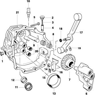 2. Carefully insert gearshift lever (no. 17 in overview). The sealing lip on the shaft sealing ring must not be damaged.