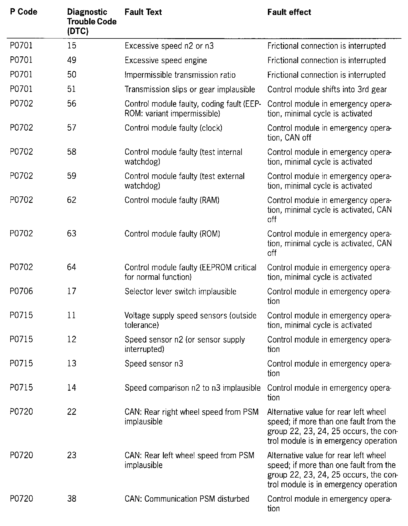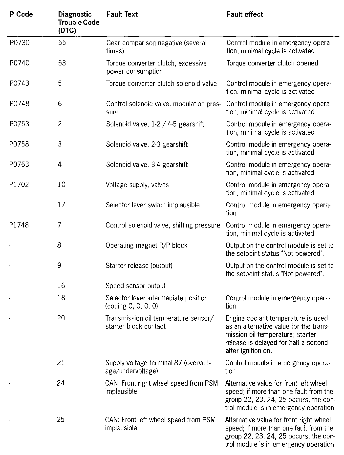 P Code, Diagnostic Trouble Code (DTC), Fault Text, Fault Effect