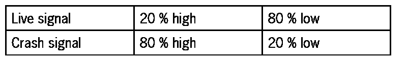 The airbag control module emits a signal to the alarm system control module no later than 25 seconds after pin S is switched on and until such a time as pin S is switched off again. This signal has a frequency of 10 Hz and indicates two states: