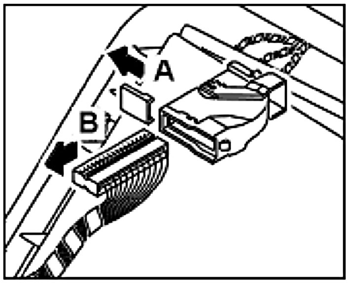 9. Disconnect the plug of the alarm control module, open the plug -A- and pull out the pin strip -B-.