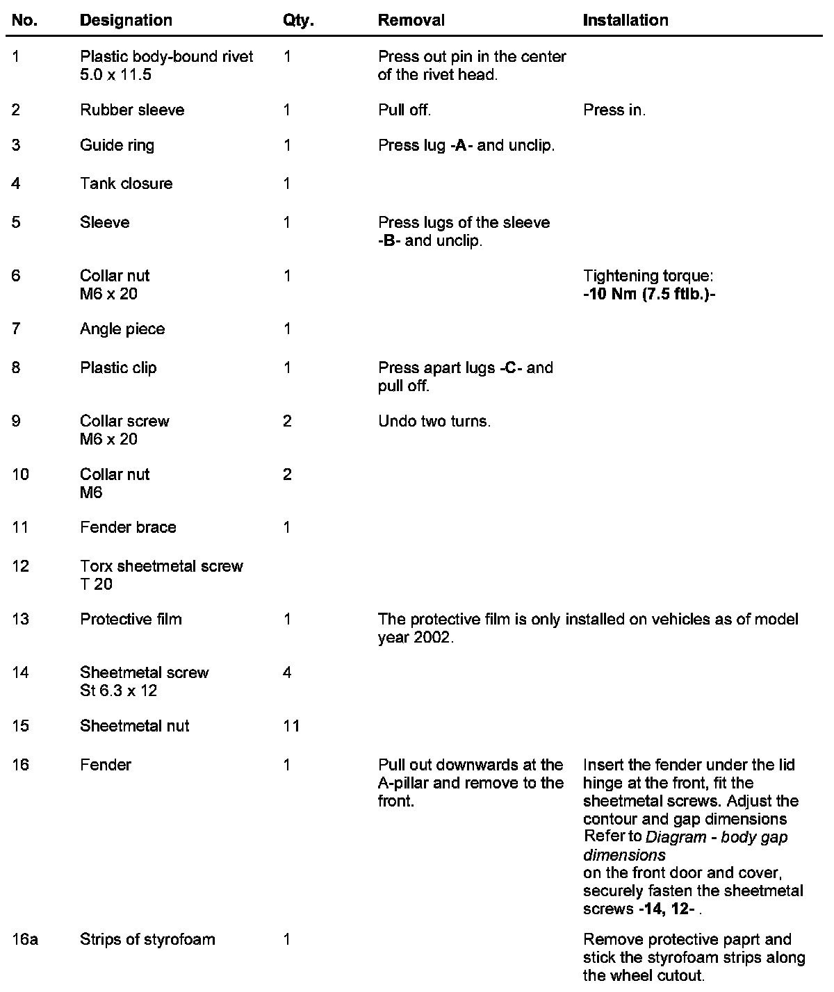 - Refer to Removing and installing wheel housing liner - up to model year 2001