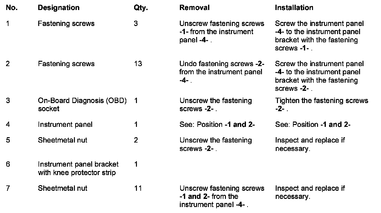 INFORMATION: Before removing the instrument panel, it must be disassembled. Refer to Disassembling and assembling the dashboard