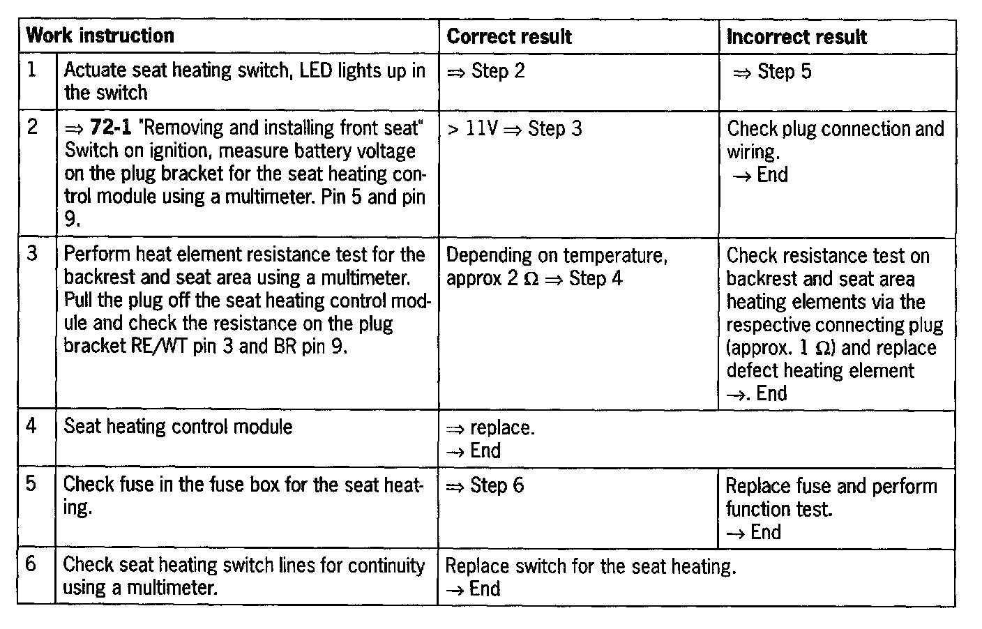 In the case of the complaint "seat heating does not function", proceed according to the work instruction. Work aids: Use wiring diagram and multimeter.