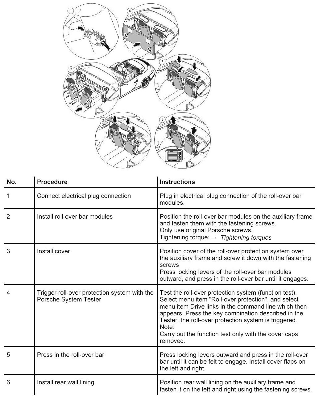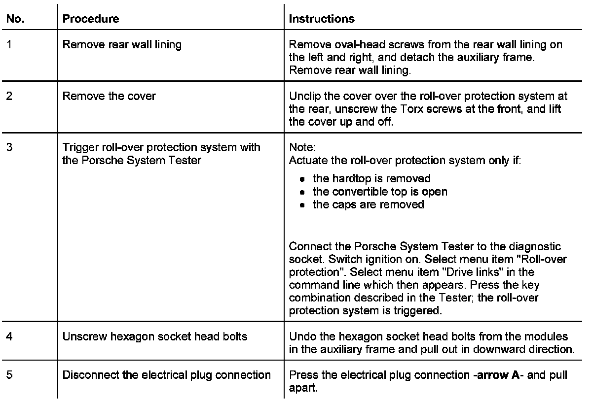 - After assembly work on the roll-over protection system - but at least every 2 years - the function of the rollover protection system must be tested by triggering it via the diagnostic interface of the Porsche System Tester.