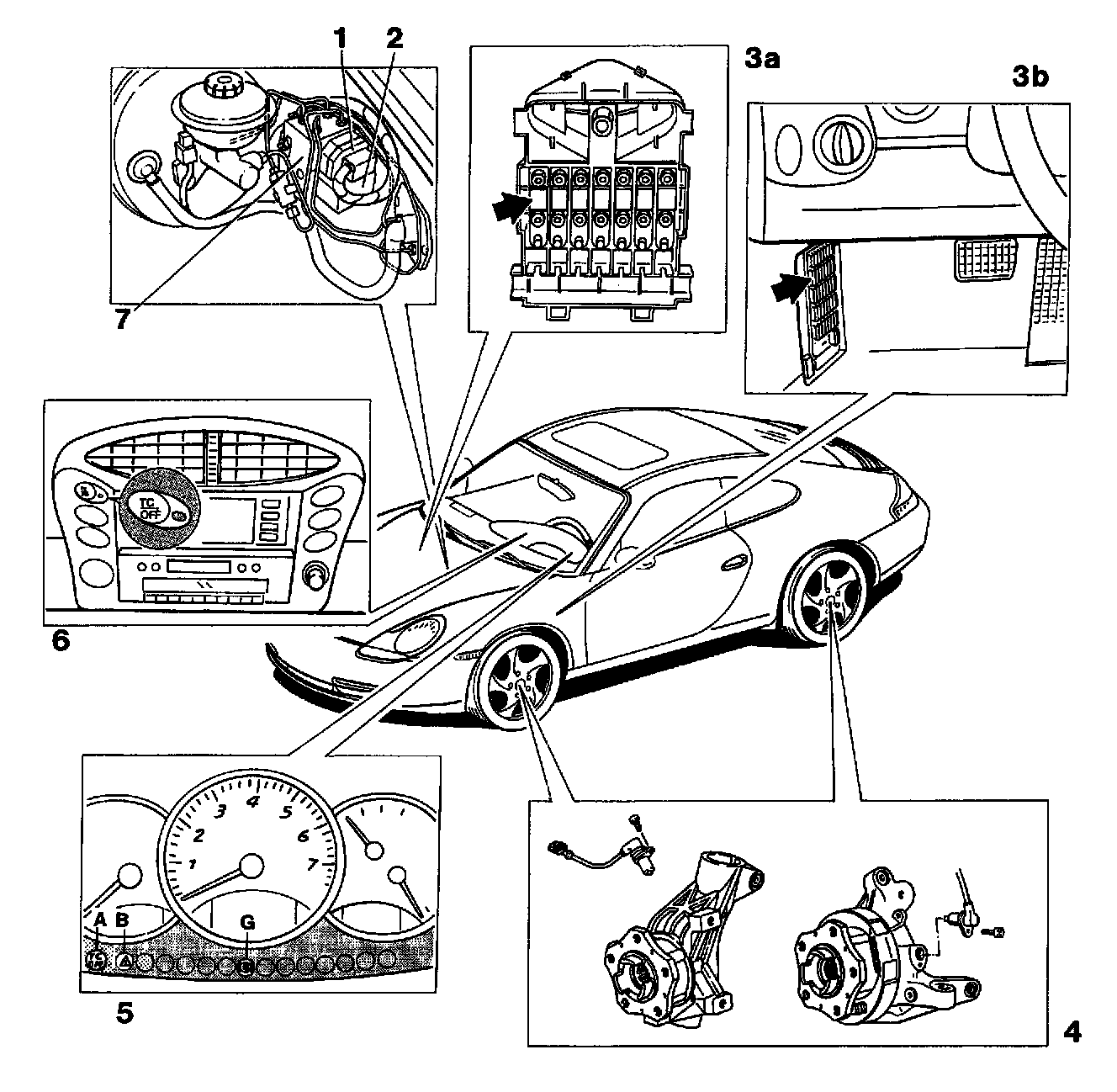 3a. A 50-A fuse in the current distributor (F1 / arrow) protects the return pump and the solenoid valves. The current distributor is located under the instrument panel. The fastening points are accessible from the luggage-compartment side.