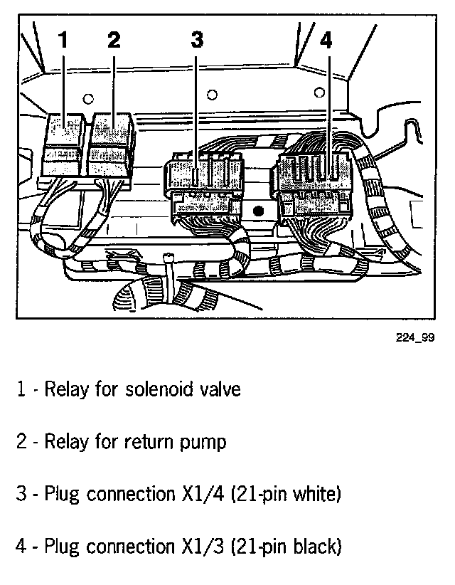 The plug connections X1/3, X1/4, solenoid valve and return pump relays are located in the passenger compartment wiring harness on the left at the front of the luggage compartment behind the PSM control module.