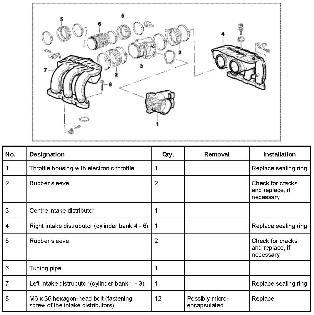 21. Remove intake distributor for cylinder bank 1 - 3 by unscrewing six M6 x 35 hexagon-head bolts. Use a small offset ring wrench (wrench size 10) for the front bolt. Remove intake distributor together with the front screw. Immediately plug or cover the intake manifold.