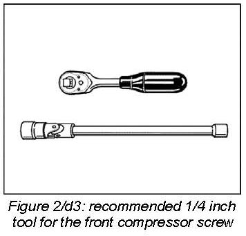d. Remove the air-conditioning compressor. Tool recommendation: 1/4 inch - Figure 2/d3 - . 3 hexagon-head bolts M8: Unscrew 2 bolts at rear -1- , 1 at front -2- . For better access to the front threaded part -2- , remove the engine compartment temperature sensor with the rubber sleeve at the right intake distributor. Remove the aluminium spacer sleeve. Disconnect the ground cable at the plug connection.