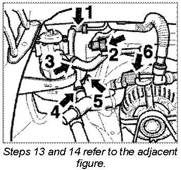 17. Undo four screw-type hose clamps -2 and 3- on the right intake side.