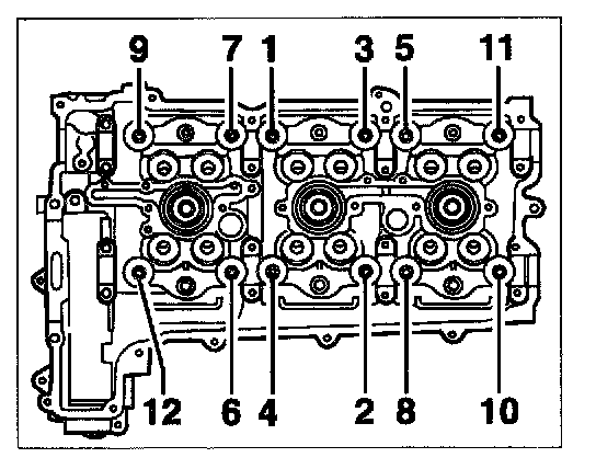 - Initial tightening in accordance with tightening sequence 30 Nm (22 ftlb.), undo all screws again