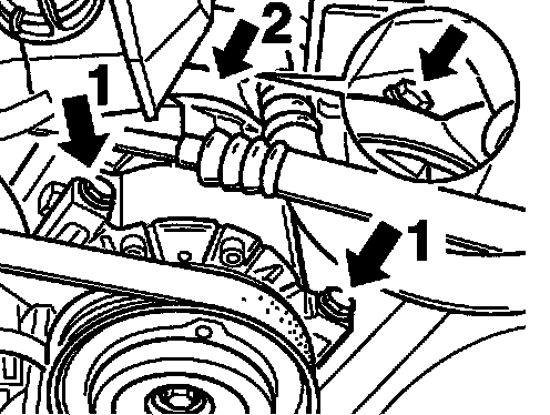 8. Place 3 M8 hexagon-head bolts onto the air conditioning compressor (2 short screws at rear -1-, 1 long screw at front -2-) and tighten to tightening torque.