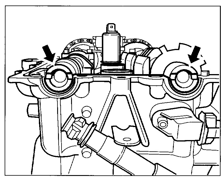 1. Align camshafts, On both camshafts, the smaller circular cut-outs must lie at the top -arrows-.
