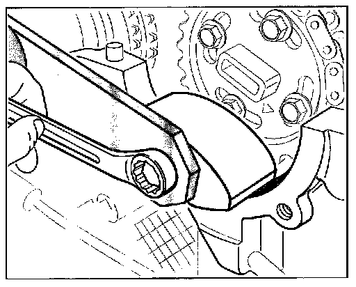 4. Fit the chain tensioner, side 1-3 (hexagon socket a/f 32). Replace sealing ring. Position the chain tensioner with new sealing ring and tighten with a torque wrench.
