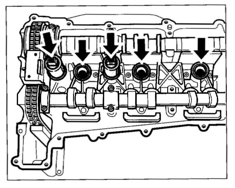 11. Insert two magnetic hydraulic valves and three seals for the spark-plug recesses. Fit new O-rings into both the magnetic hydraulic valves and insert into the bores in the cylinder head. (Camshaft adjustment with dowel pin, valve lift control without dowel pin). Replace the three seals for the spark-plug recesses.