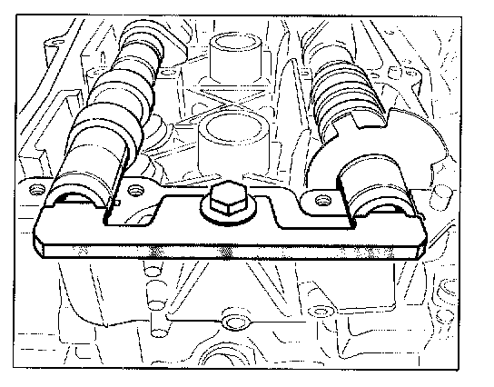 2. Fix the camshafts with special tool adjustment gauge No. 9686 and fasten the gauge with one M8 auxiliary screw (e.g. M8 x 16 hexagon-head bolt) (flat tool surface should face upwards). Only tighten the screw slightly.