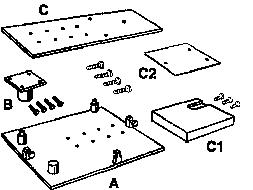 4. Fit the support for the Tiptronic transmission -C1- (and if necessary the spacer plate for the tolerance compensation -C2-) with 3 wooden screws (2 screws 6x20 and 1 screw 8x25) to the support plate 9592/1.