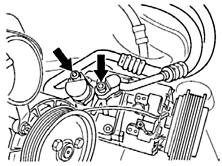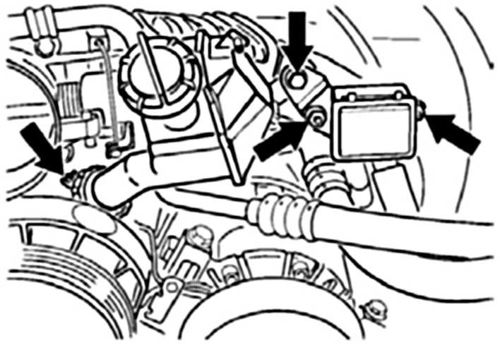 7. Undo compressor fastening screw between the intake pipes of cylinders 4 and 5.