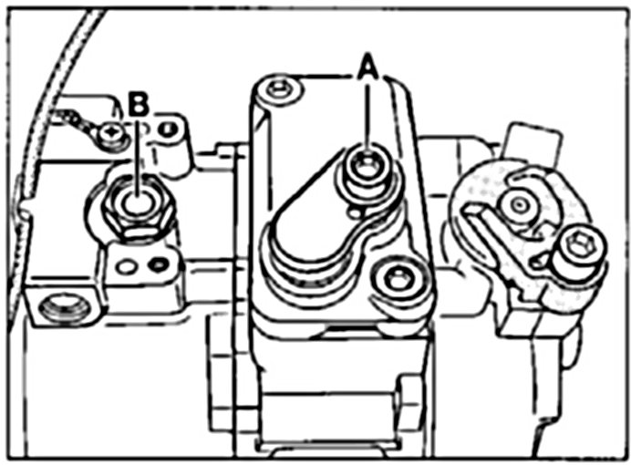 2. Open the oil filler screw (B) on the compressor.