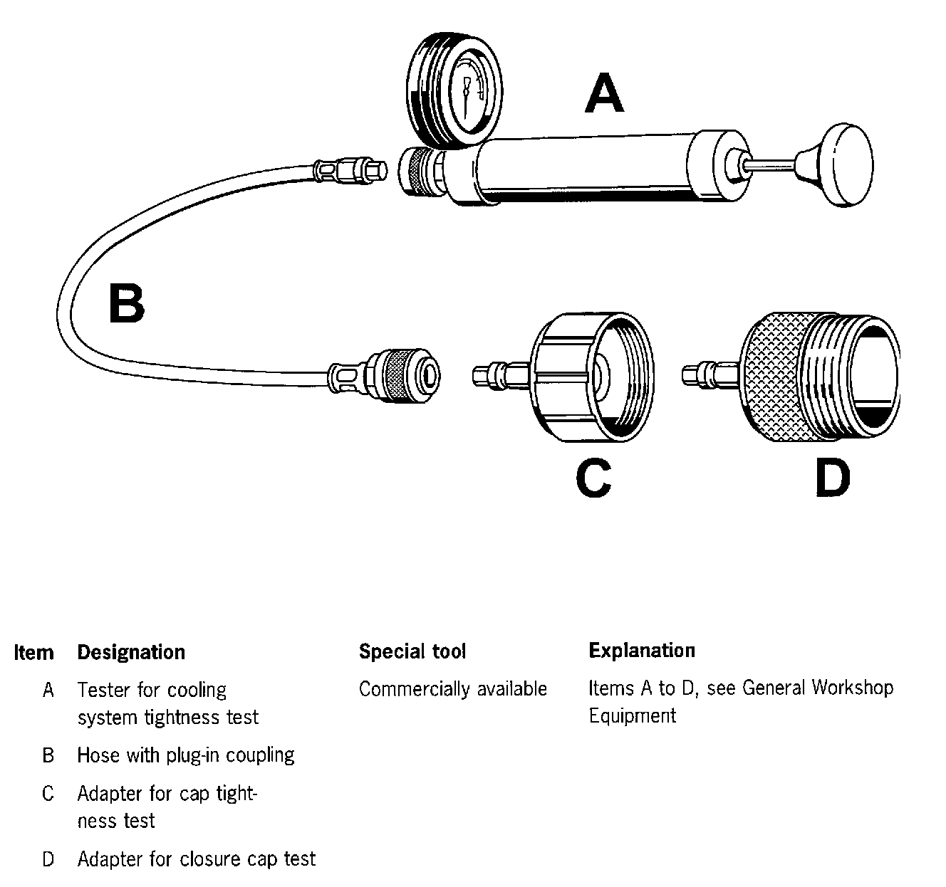 2. Pump the cooling system up to an excess pressure of 1.3 bar. If the pressure decreases, locate the leak and remedy the fault. Check pressure relief valve(s) in the cap. Screw the tester, adapter and cap together.