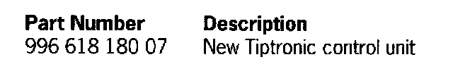 1. Install and code the new Tiptronic control unit, part No.996.618.180.07, as described in the 911 Carrera (996) Technical Manual, Group 3, Chapter 37 30 19.