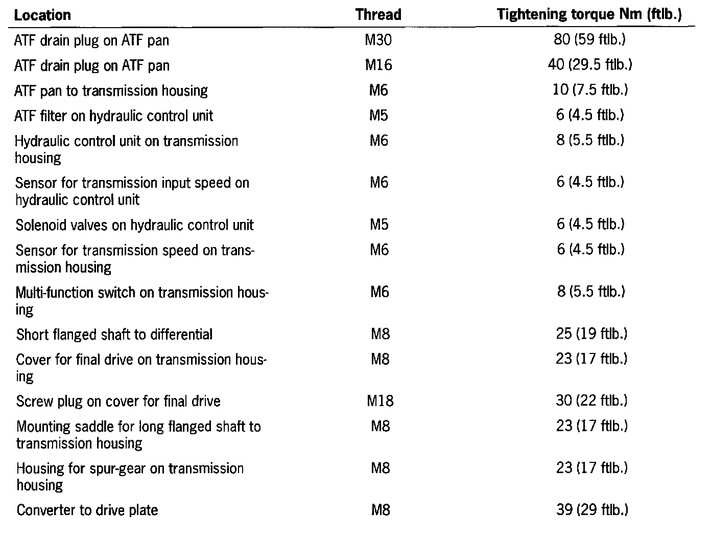 Tightening torques for transmission A96/00