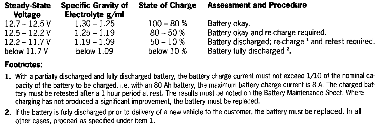 If the specific gravity of the electrolyte in the individual battery cells should again differ by more than 0.03 g/ml, the battery must be replaced. The battery test as well as the documentation (also see Battery Maintenance Sheet, top left) must be repeated at the following intervals: