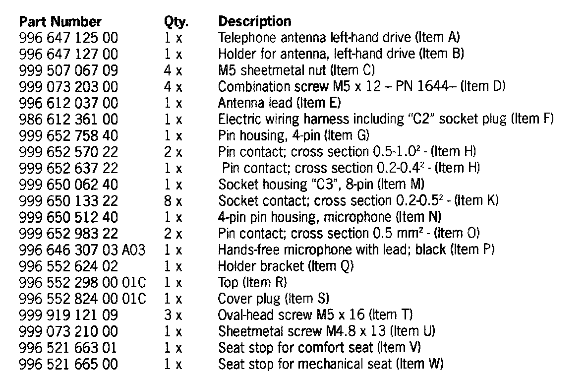 Telephone preparation for mobile telephones contains an antenna integrated in the radiator tank, various wires, a microphone, as well as a bracket for the mobile telephone holder. The hands-free microphone must be set to the type of mobile phone (see Technical Manual, Group 9, Part ID. 9157).