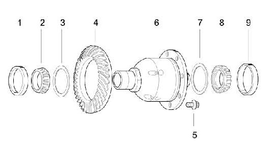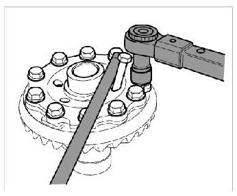 1. Position crown wheel on differential housing and screw in screws in diagonally opposite sequence until