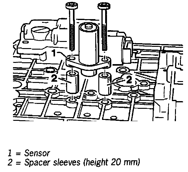 1. Using the two spacer sleeves, install sensor and tighten fastening screws to 6 Nm (4 ft. lbs.).