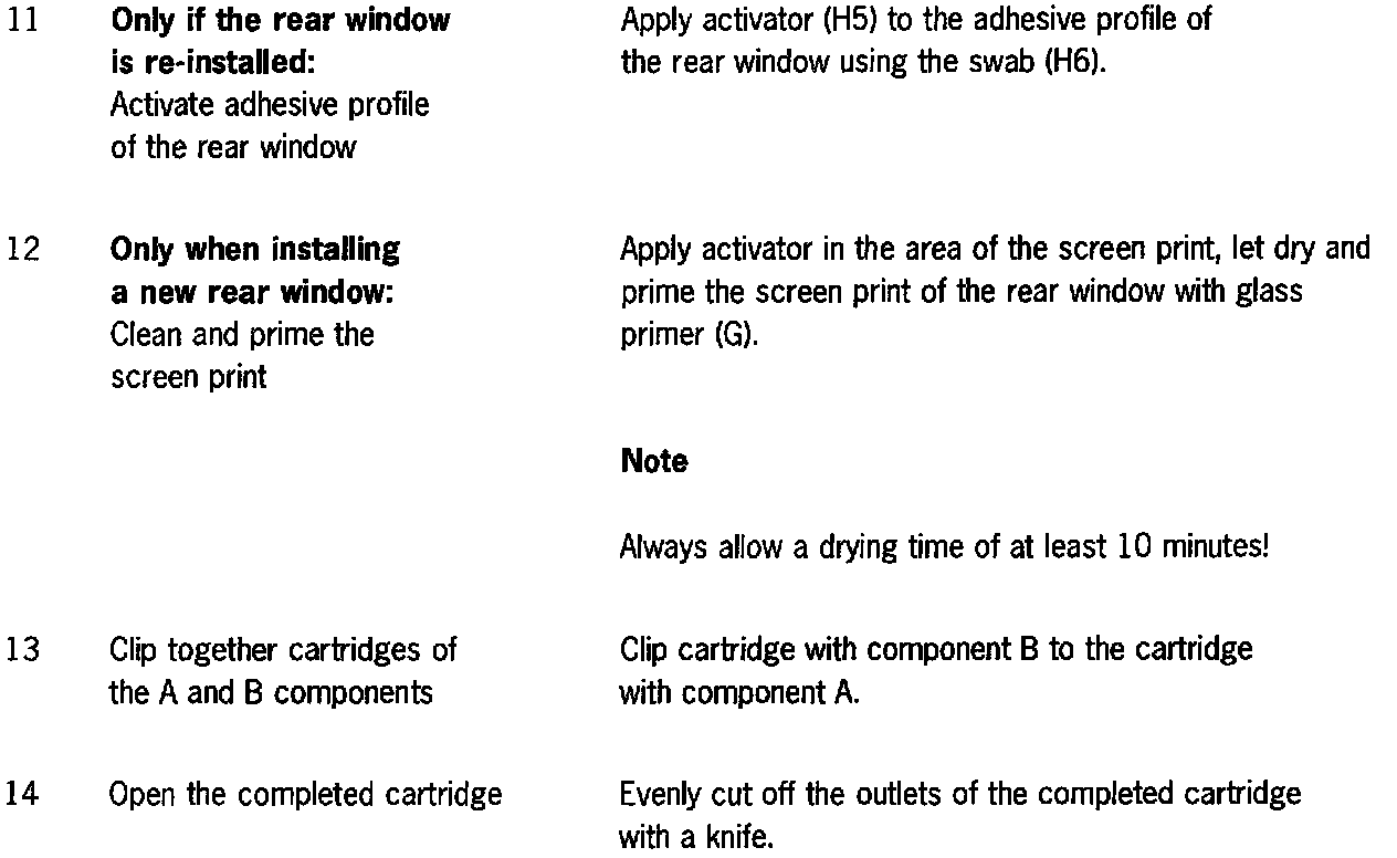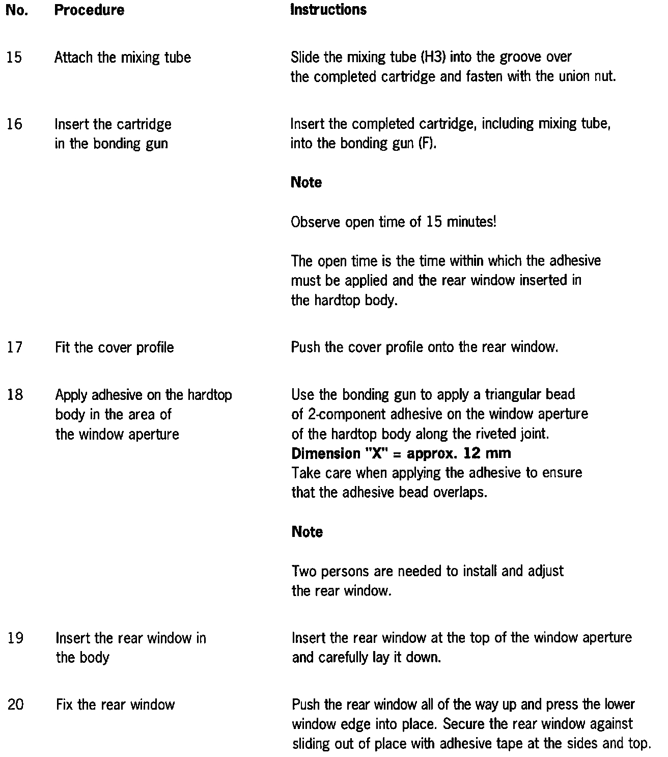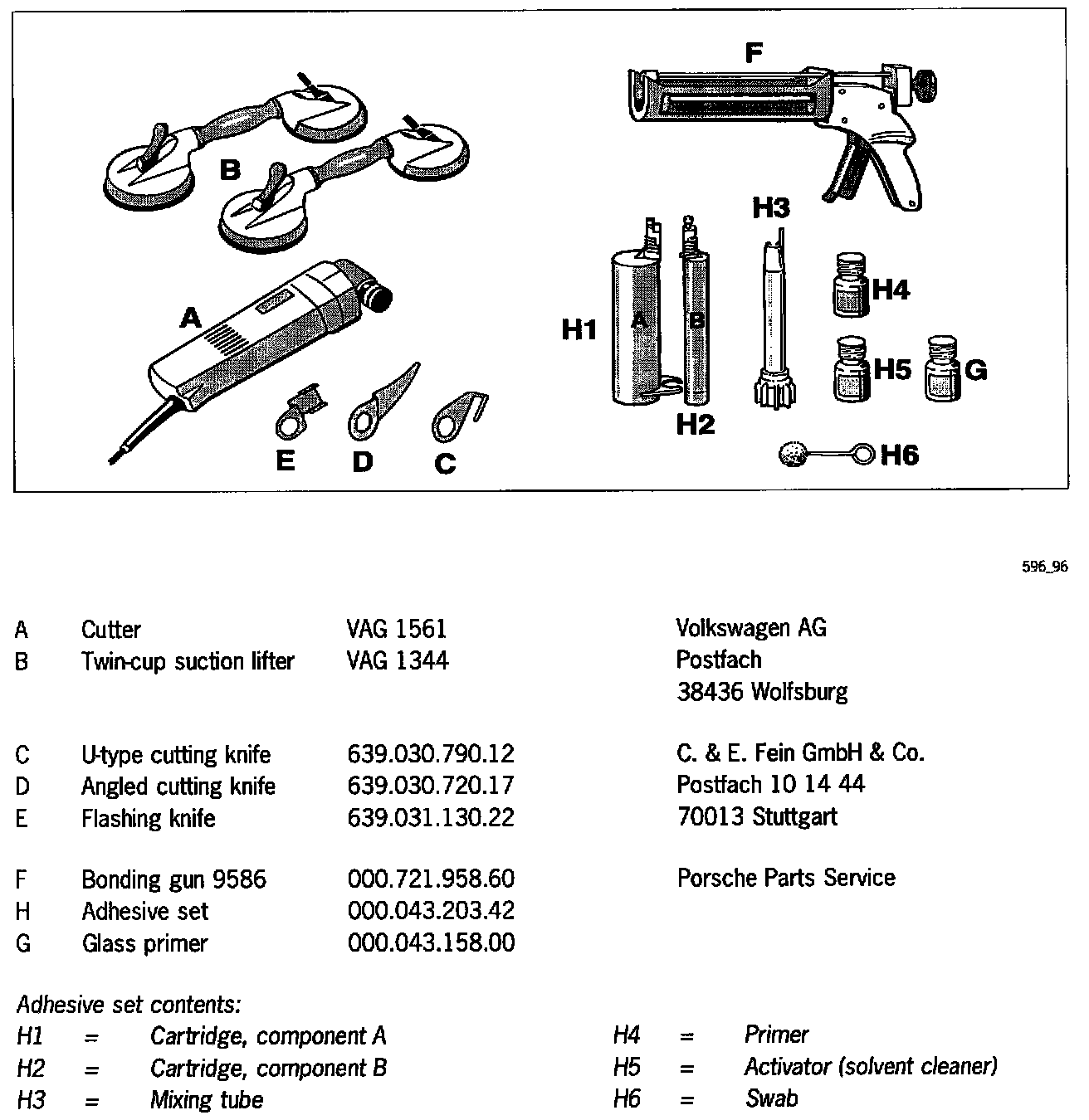 The following tools and materials are required for removal and installation of the rear window on the hardtop with two-component adhesive: