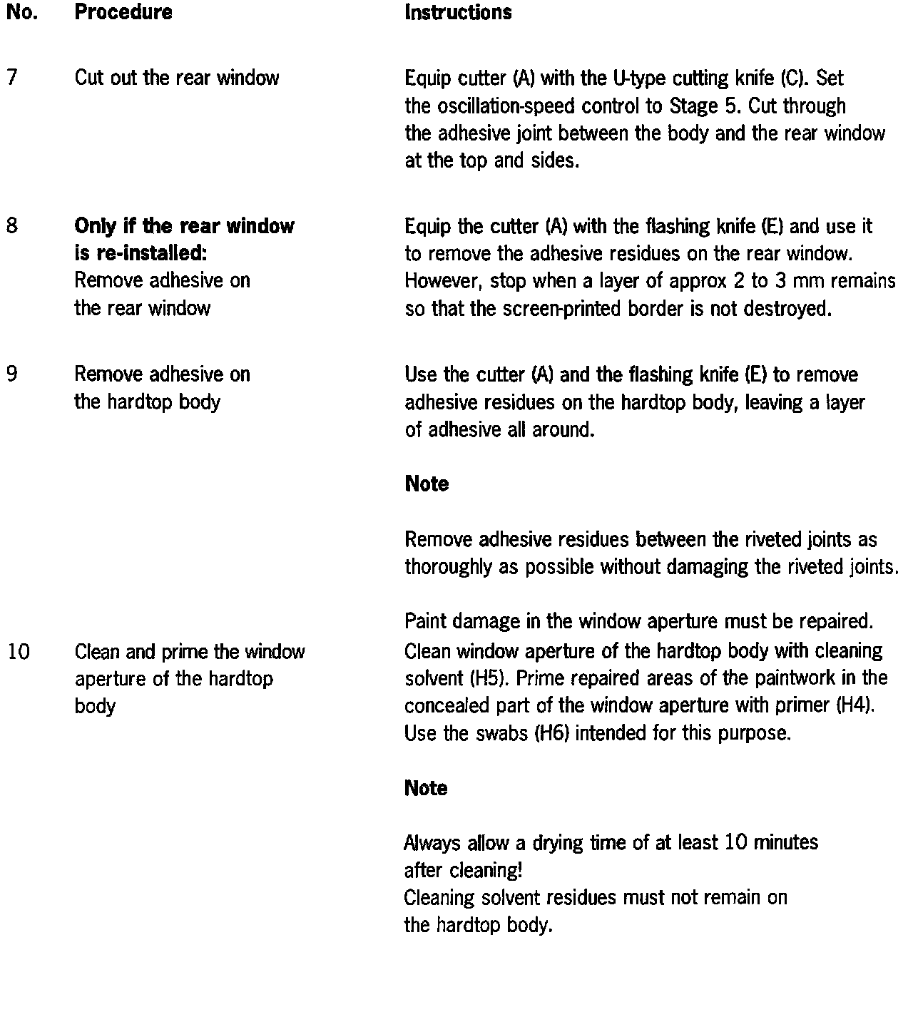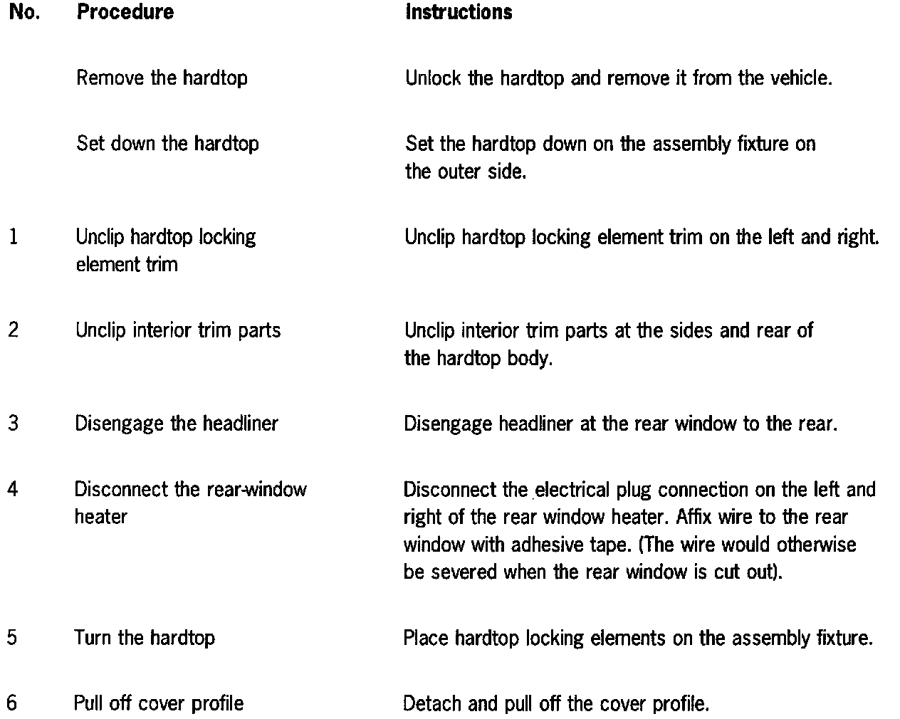 WARNING: The hardtop body parts are riveted together; the riveted joints will be destroyed if the rear window is cut out improperly!