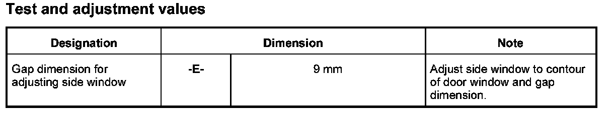 2.1. Moving the side window into the clamping jaws on the receiving rollers equalizes the angle of the side window to the door window. The window bottom edge must lie against the receiving rollers in the clamping jaws -inset-. Adjust side window to contour of door window and the -gap E = 9 mm-. Tighten the clamping jaws after completing the adjustment.