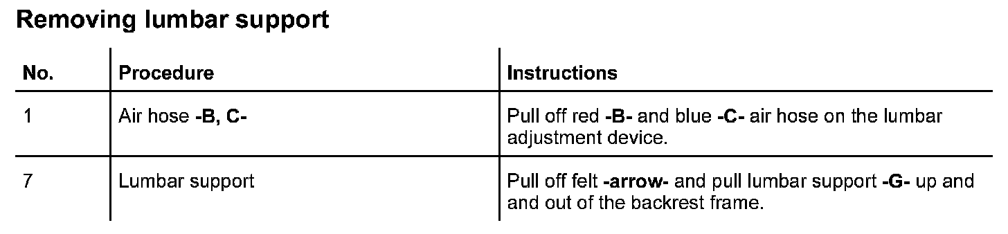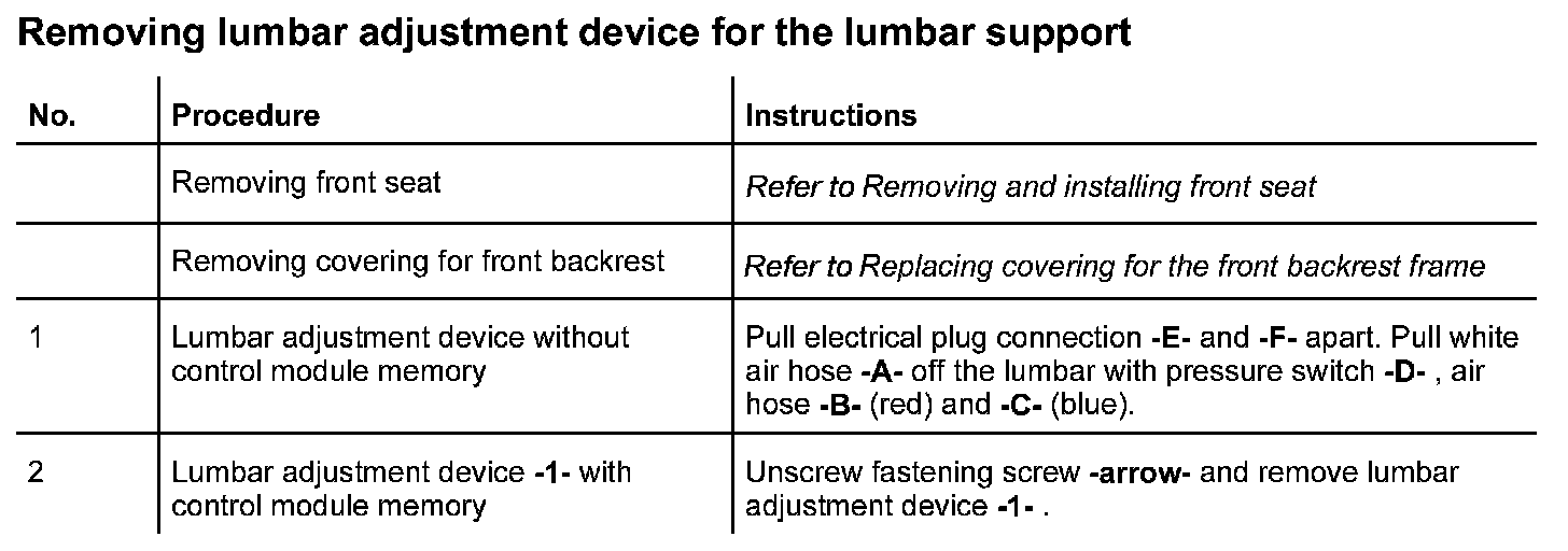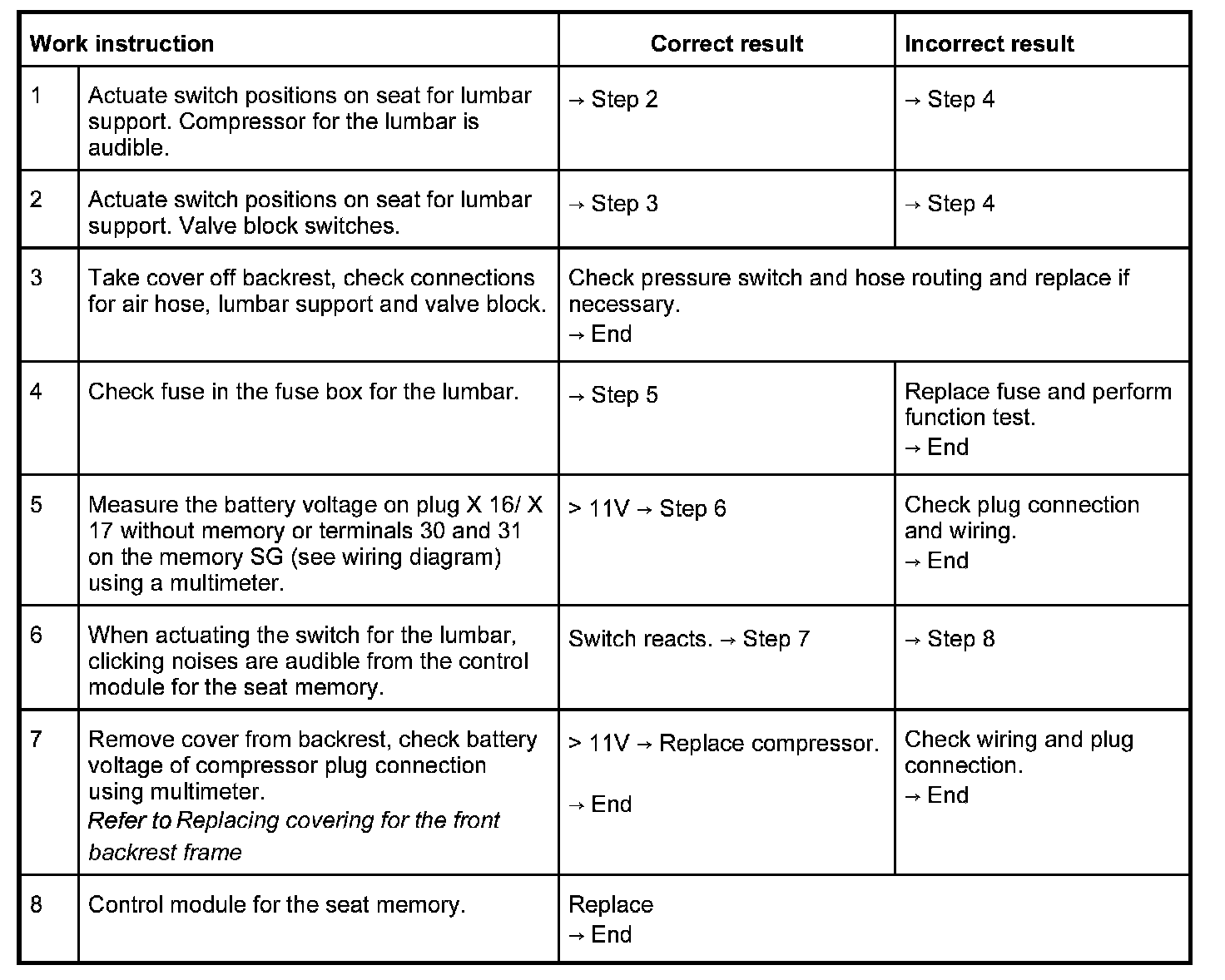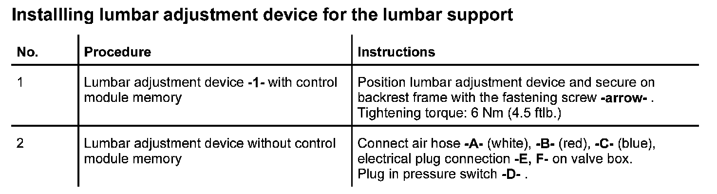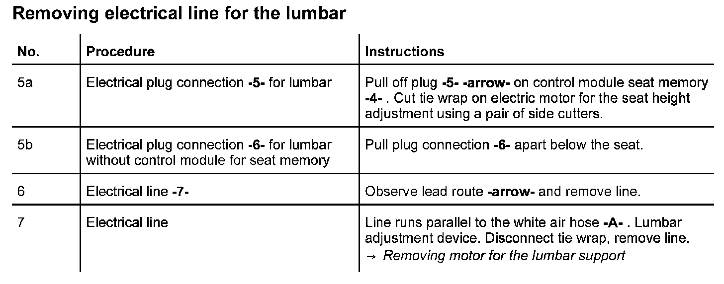 In the case of the complaint "lumbar support does not function", proceed according to the following work instruction. As the seat functions vary, the test plan principally complies with the seat version with seat memory adjustment. Work aids: Use wiring diagram and multimeter.