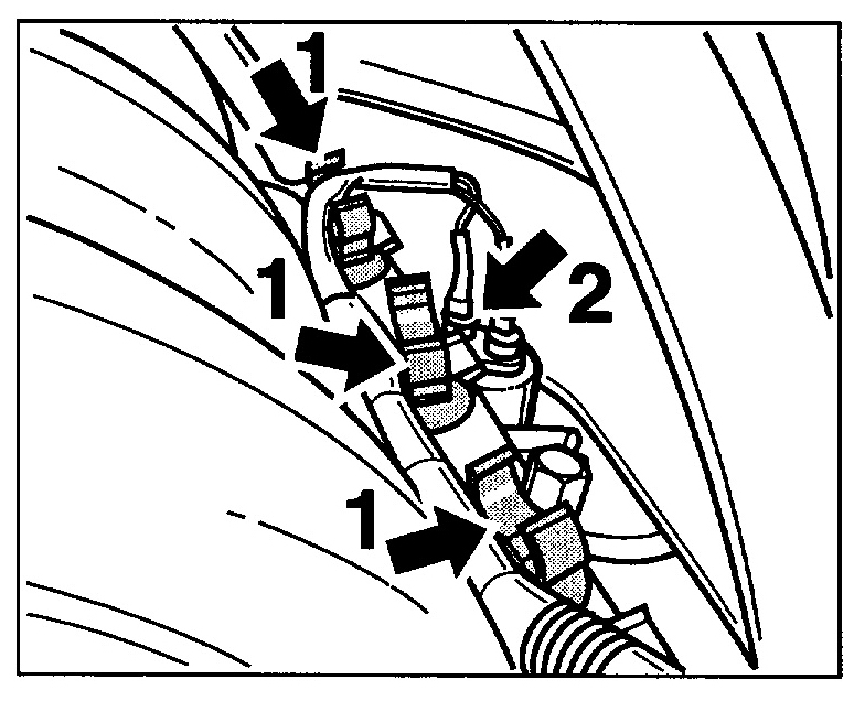 3. Disconnect plug connection of the fuel line -1-. Unclip fuel line at the plastic clip of the coolant expansion tank. Collect emerging fuel with a cloth.