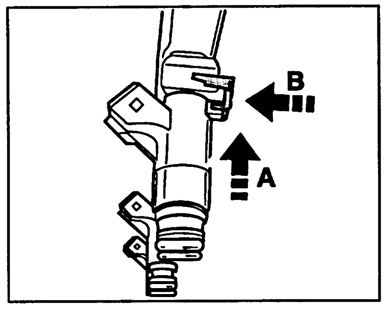 6. Pull the retainers off the injection valves -A- and pull the injection valves out of the fuel collection pipe -B-. Make sure that all O-rings are present on the injection valves. Collect emerging fuel with a cloth.