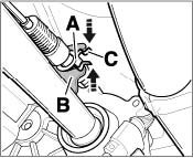 8. Remove support bracket sleeve -A- on selector lever cable from support bracket -B-. To do this, press retaining clip -C- together and pull the support bracket sleeve out of the support bracket.