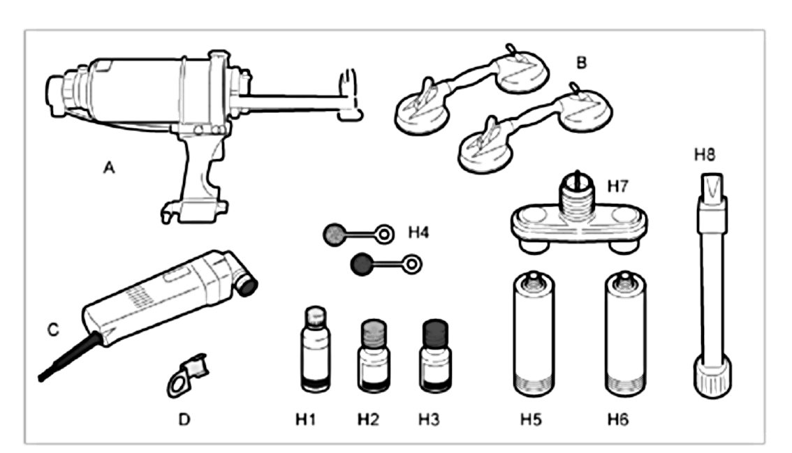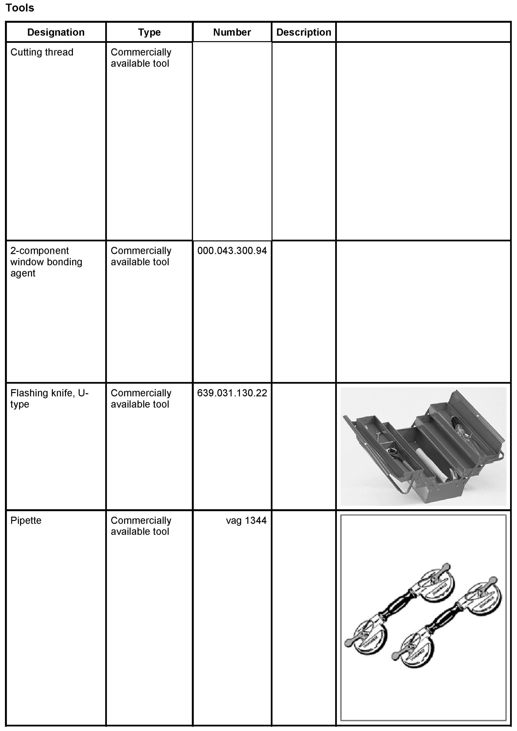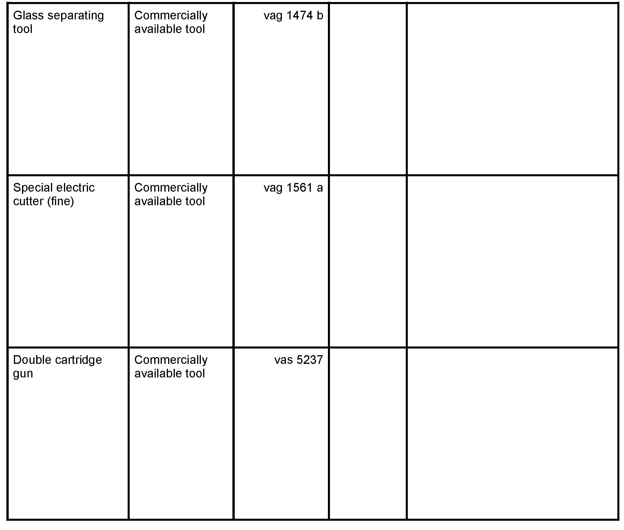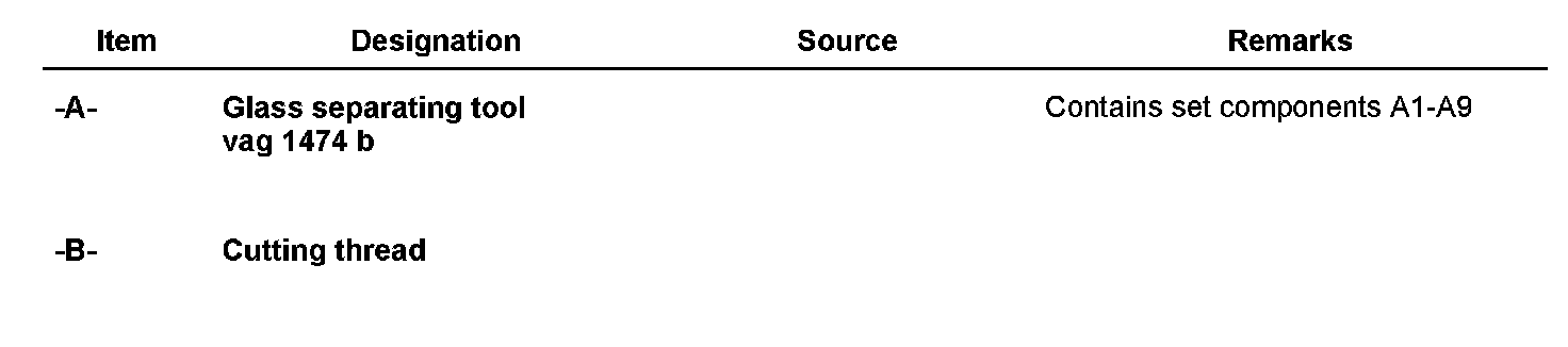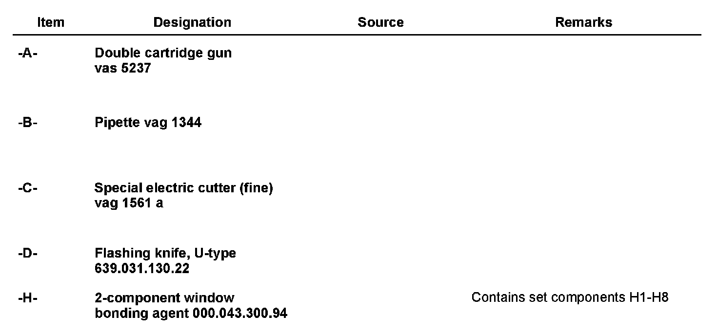 The following tools and materials are required for removal and installation of the rear window with 2-component adhesive: