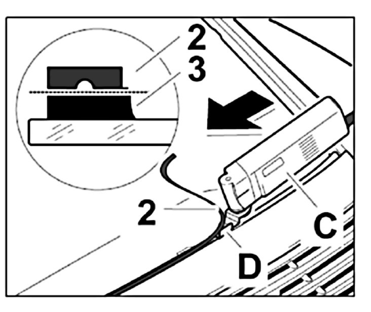 1.1. Equip cutting device -C- with the flashing knife -D- and remove the remaining adhesive from the rear window, ensuring that a surface coating of adhesive remains.