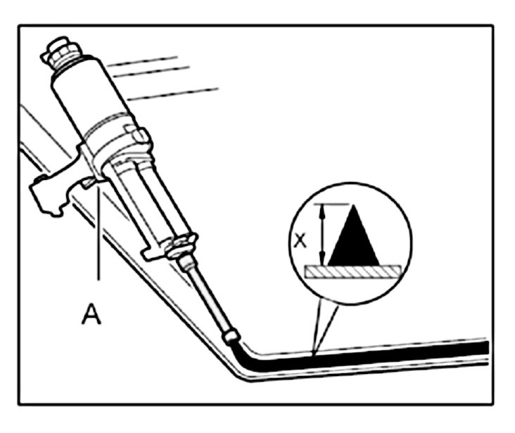 3.1. Apply 2-component bonding material with the adhesive gun -A- to the rear window along the cover section as a triangular bead measuring -X = approx. 15 mm-.