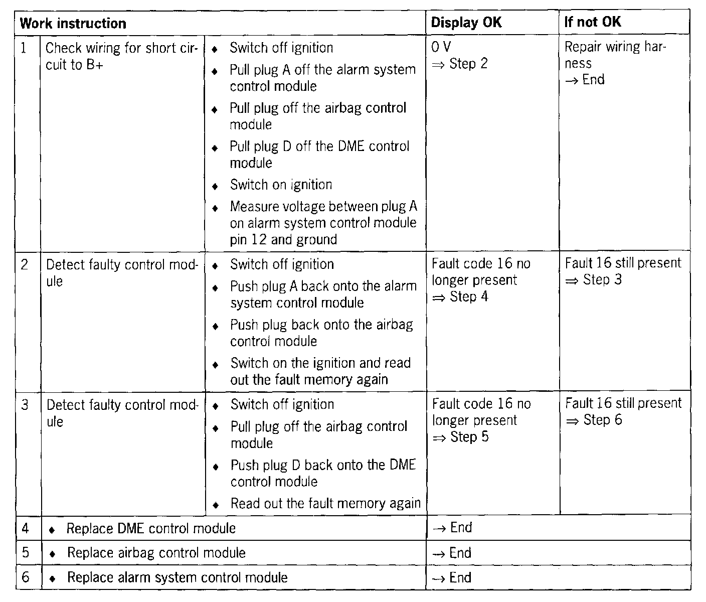 - Short circuit to voltage in wiring between the alarm system control module and the airbag and DME control modules