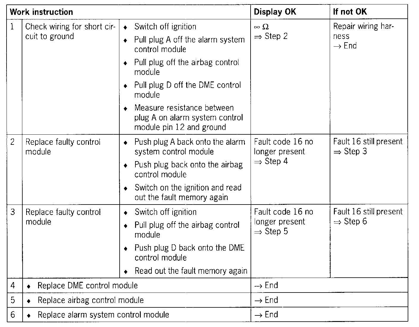 - Short circuit to ground in wiring between the alarm system control module and the airbag and DME control modules